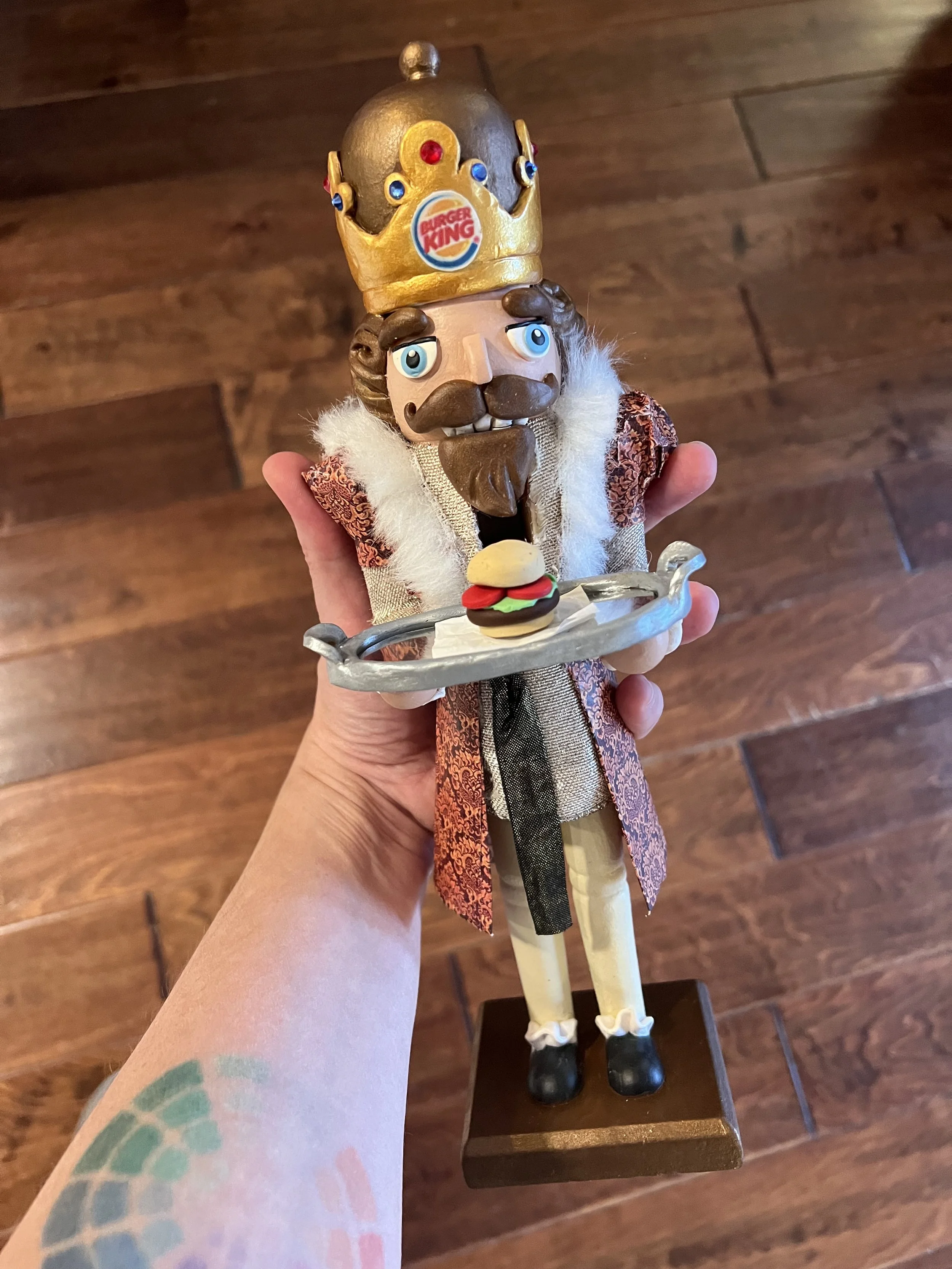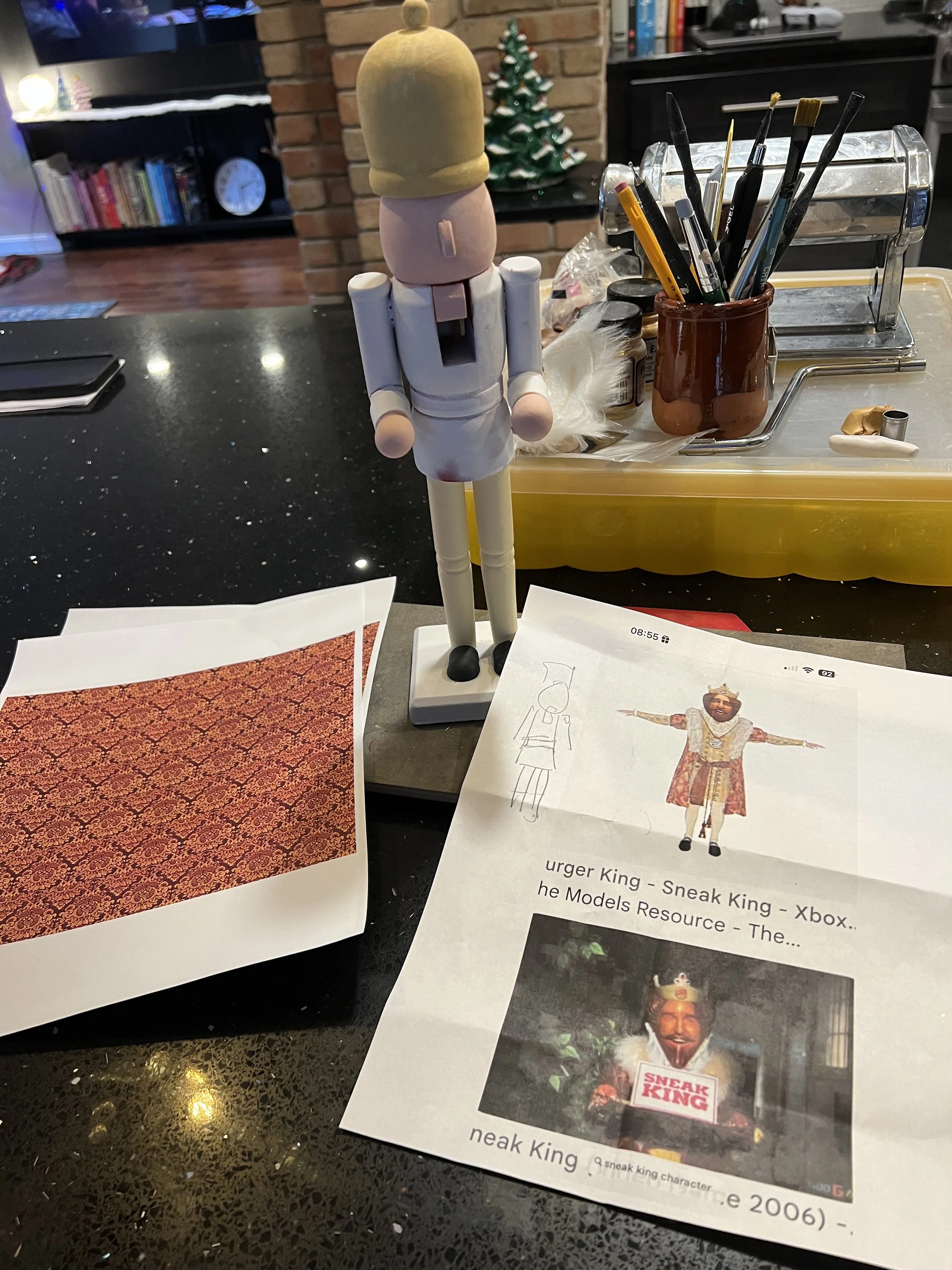 Honoring the Great Creeper himself, Sneak King! Made this guy with an $8 Walmart nutcracker, polymer clay, printed copy paper, canvas sheets, sparkly ribbons, some teeny tiny Swarovski crystals that I kept super-glueing to my hands, aluminium foil, craft acrylics, and tons and tons and tons of sealer. I am pleased to report that his nutcracker jaw is still functional—an essential detail for His Flame-Broiled Highness.