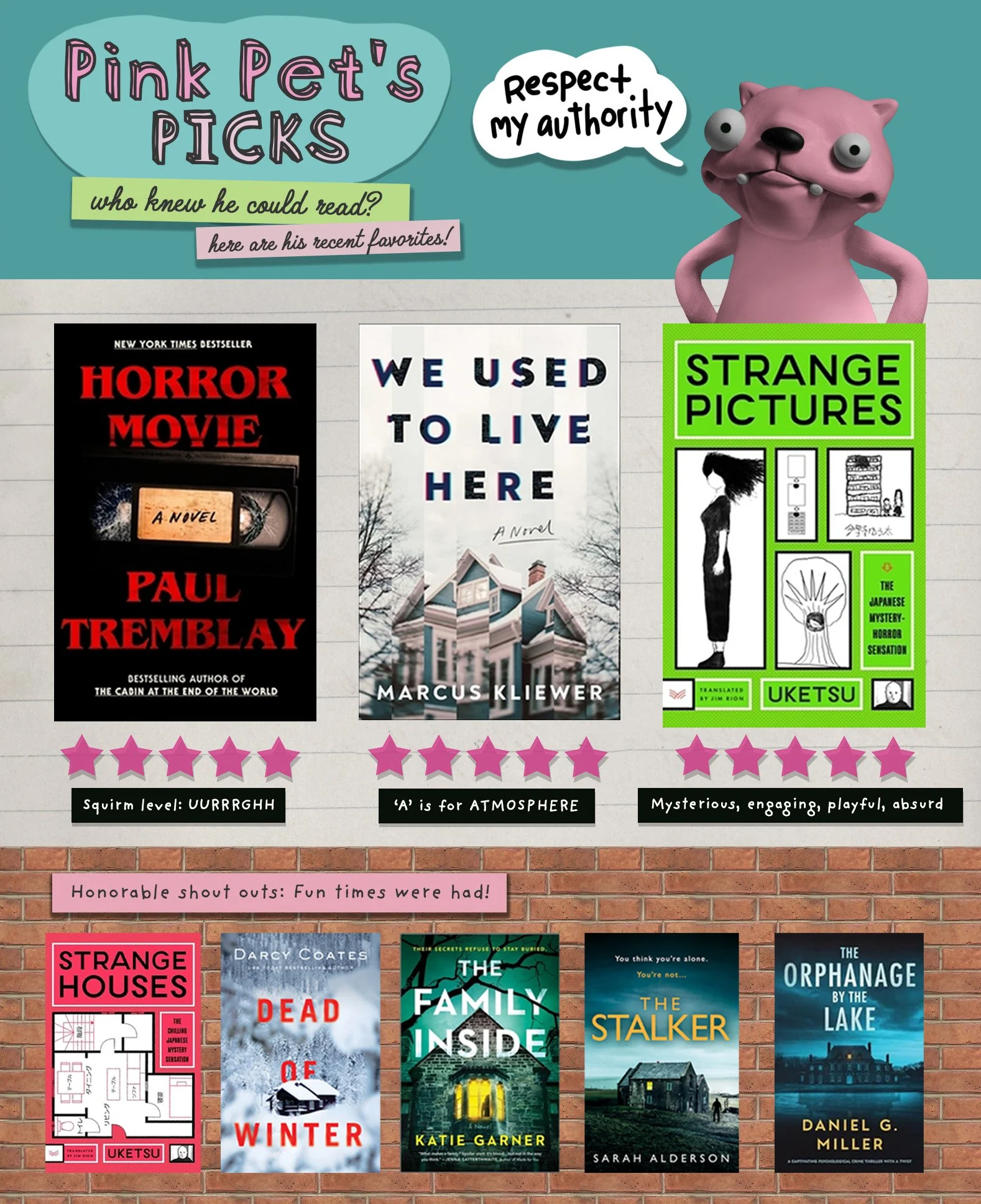 I’ve had some luck with horror books lately! Trudged through some underwhelming slop and had some DNFs as well, but this is not the place for negativity. Instead, let’s celebrate the nicer things, like being force-fed one’s own pinky finger and theorizing about secret child assassins that may or may not (but obviously must be) living in the walls.